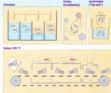 De onderdelen worden in draaiende trommels behandeld, zodat elk oppervlak gelijkmatig wordt bedekt. Na afloop volgt een passivering die zorgt voor extra bescherming en een kenmerkende zilvergrijze of blauwige glans.